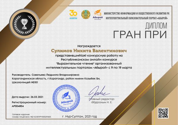 Поздравляем Сулимова Никиту ученика 1-Е класса за два призовых места в Республиканском онлайн конкурсе «Я талантлив», организованный интеллектуальным порталом «Абырой»