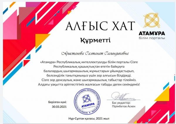 Наурыз мейрамына арналған Қарағанды қаласының ашық онлайн турнирінде 2-орын алғаны үшін 6”Ә” сынып оқушысы Кәріғұл Айзере марапатталды. Құттықтаймыз!
