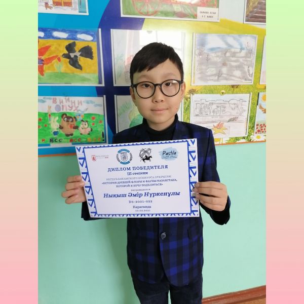 Поздравляем ученика 2 «Е» класса Нықыш Әміра за занятое III место в Республиканском конкурсе открыток «История древней флоры и фауны Казахстана, которой я хочу поделиться». Ж…