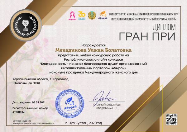 Интелектуальный образовательный центр «Абырой» наградил ученицу 5 «Е» класса Ким Анну - Гра При, представившую конкурсную работу на Республиканском онлайн конкурсе &laqu…