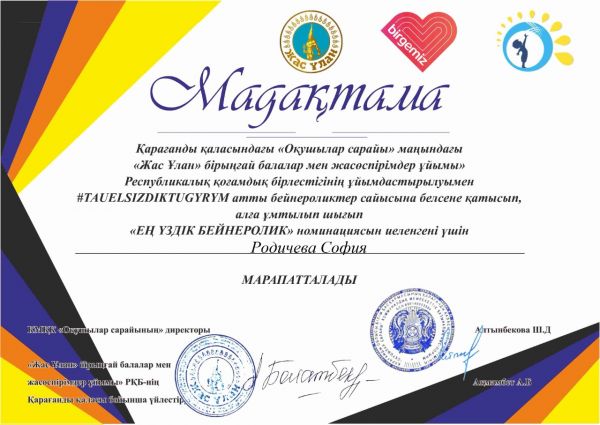 25 қаңтарда Жас Ұлан балалар және жасөспірімдер ұйымында #Tayelsizdiktugyrym атты бейнероликтер байкауында Ең үздік бейнеролик номинациясымен 10 а сынып оқушысы Родичева Софияны құттықтаймыз