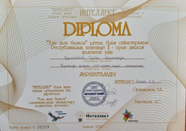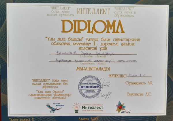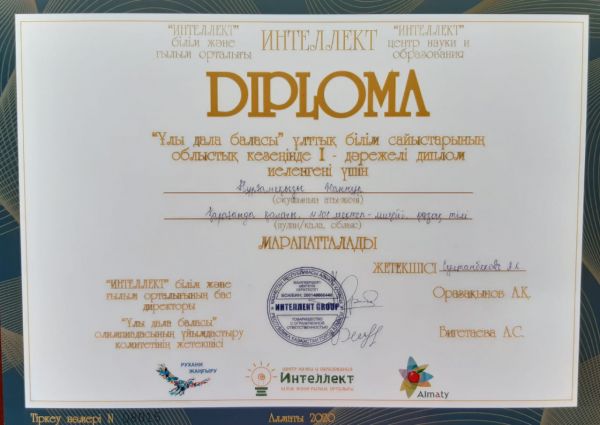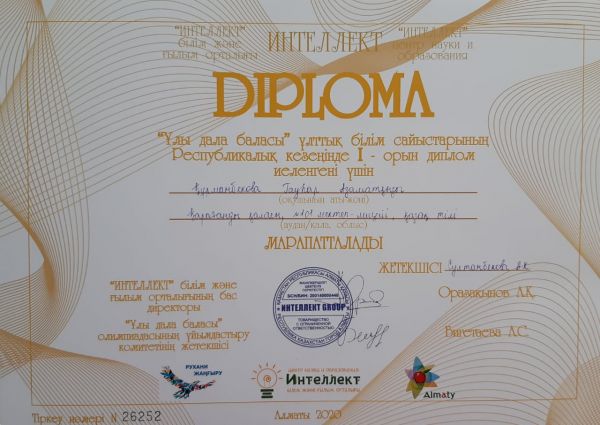 «Ұлы дала баласы» ұлттық білім сайыстарының облыстық кезеңінде І дәрежелі дипломмен 7 «А» сынып оқушылары марапатталды. Нұрғалиқызы Жаннұр –қазақ тілі, Құрманбекова Гау…