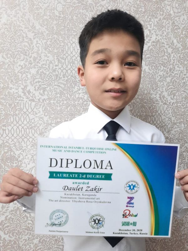 Дәулет Зәкір учащийся 4 «З» класса участвовал в международном конкурсе онлайн инструмент домбра в Турция г Стамбул. Получил диплом лауреата 2 степени между странами Казах…