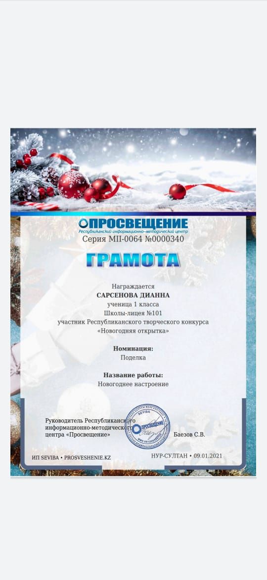 Поздравляем учащихся 1"З" и 4 "З" классов с победой в Республиканском конкурсе " Новогодняя открытка".