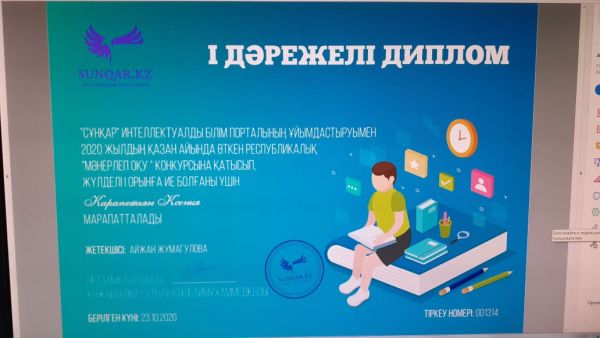 Ученик 2 "Б" класса Асқарұлы Шахназар занял 1 место в Республиканском конкурсе "Золотая осень",организованном интеллектуальным образовательным порталом "Сұңқар"!Руковод…