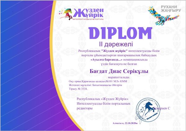 Ученик 2 "Б" класса Бағдат Диас занял призовое 2 место в номинации "Когда я езжу в село..." творческого конкурса,организованном Республиканским интеллектуальным образовательным п…