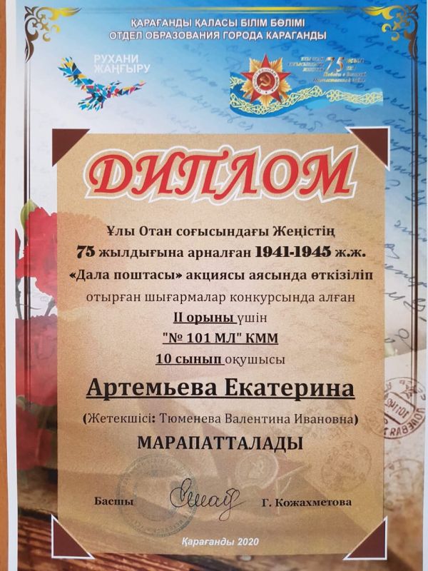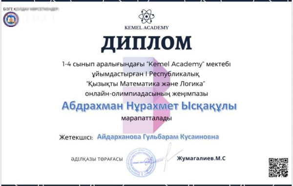 "Ұлы Абай оқулары" атты республикалық шығармашылық байқаудың жүлделі 1 орын иегері 2 "Ә" сынып оқушысы Қыдыркелді Саламатты жеңісімен құттықтаймыз!