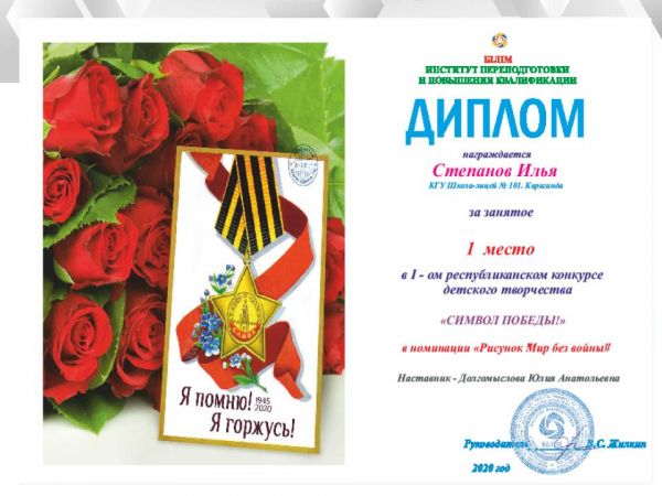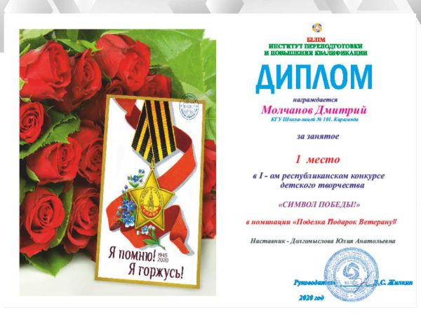 Поздравляем учащихся 3 «З» и 4»К» классов с победой в  I - ом Республиканском конкурсе детского творчества «СИМВОЛ ПОБЕДЫ!» в номинации «Рисунок…