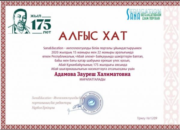 "Абай әлемі" байқауына шәкірттер дайындағаны үшін Адамова Зауреш Халиматовна "Алғыс хатпен" марапатталады. #goroo_krg#школыкараганды