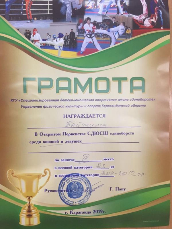 Қарағанды облысы "Балалар және жасөспірімдер спорт мектебінің" ұйымдастыруымен өткен ашық жекпе-жек біріншілігінде 2 "Ә" сынып оқушысы Байжұма Ерман жүлделі ІІІ орынды иел…