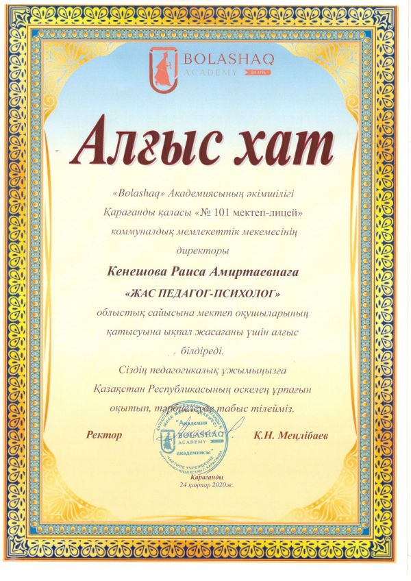 «Bolashaq» Академиясының әкімшілігі Қарағанды қаласы «№101мектеп – лицей» комуналдық мемлекеттік мекемесінің ұйымдастырумен «ЖАС ПЕДАГОГ – ПСИХОЛОГ&r…
