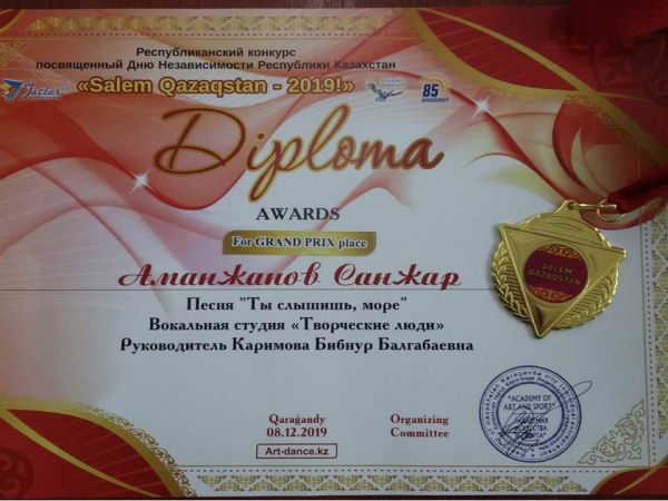 Тәуелсіздік күні қарсаңында өткен Республикалық конкурста 4Ә сынып оқушысы АМАНЖАНОВ САНЖАР әншілер арасында Гран При жеңіп, дипломмен марапатталды.