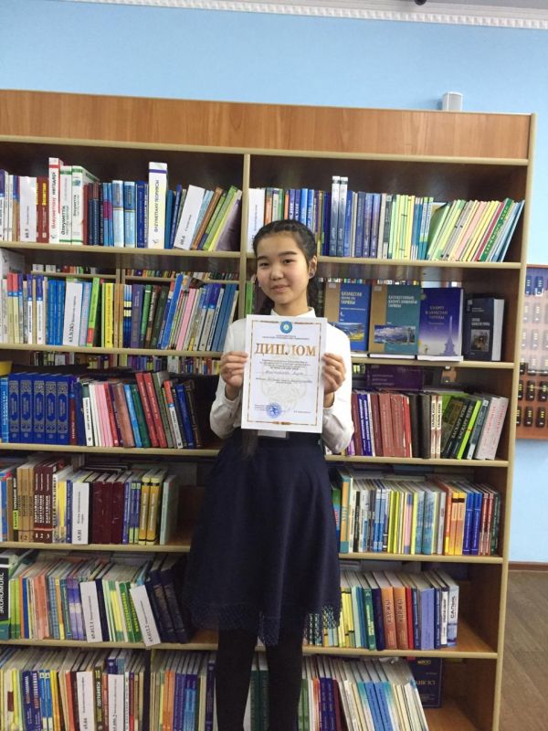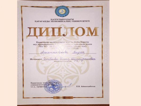 Ученица 9 «А» класса Арыстанбекова Мадия была награждена дипломом ІІІ степени в олимпиаде по казахскому языку «Тіл білгірі» среди учащихся 9-11 классов общеобразователь…