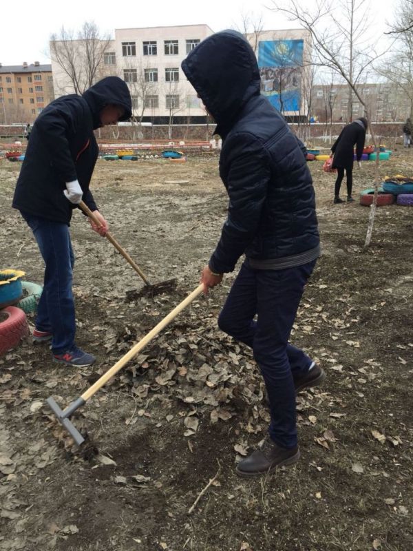 С 14 апреля на территории школы началась санитарная очистка. Ученики 3-11 классов, вместе с педагогическим коллективом и техперсоналом после зимы приводят в порядок школьный двор.