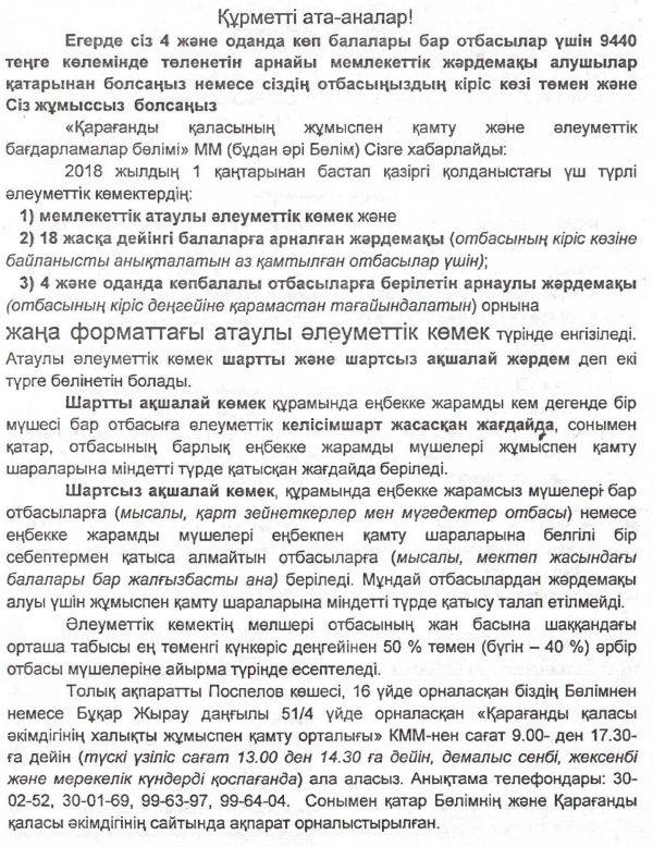 С 1 января 2018 года вводится новый формат выплат АСП (адресной социальной помощи), как механизма социальной поддержки малообеспеченных граждан и семей. Ныне действующие специальные государств…