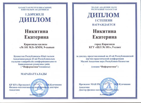 29.04.2017г. были подведены итоги 43-ей Республиканской научно – практической конференции  Малой Академии наук Республики Казахстан. Никитина Екатерина ученица 9В класса награждена &ndash…