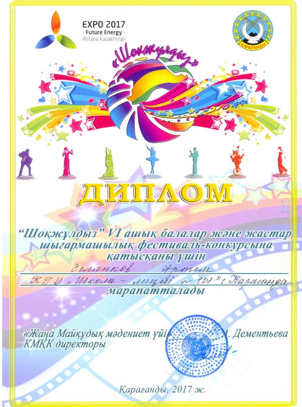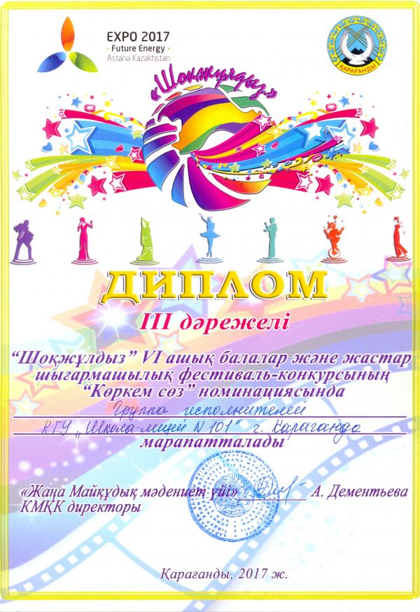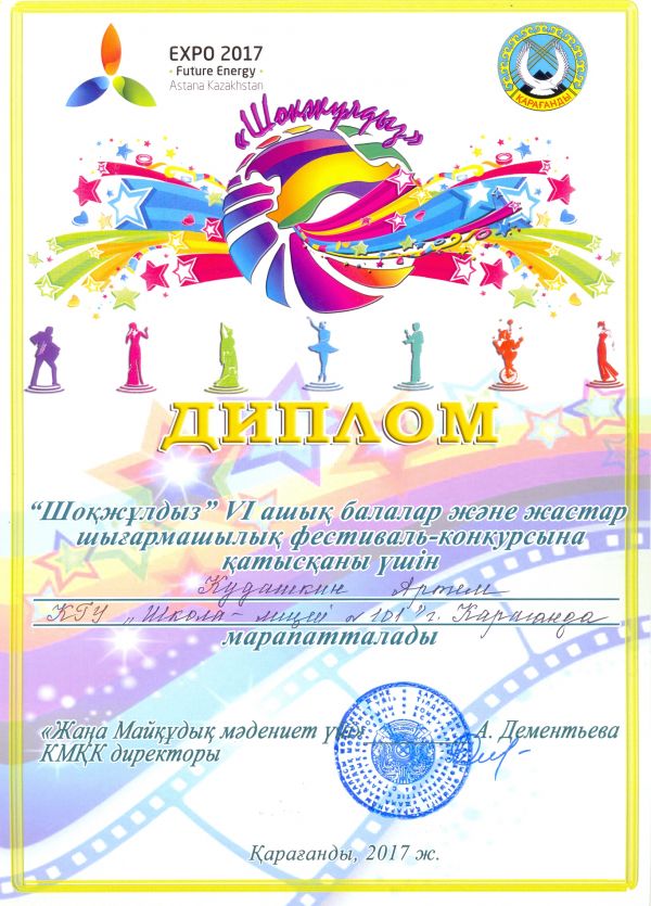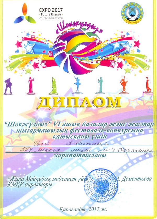30 апреля в ДК нового Майкудука состоялся республиканский конкурс юных талантов «Шоқ Жұлдыз». В номинации эстрадный вокал выступала ученица 1 класса «ж»  ШЛ №101  …