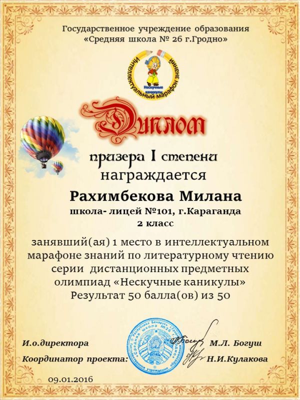 Жалпы орта және қосымша білім беру ұйымдарының білім алушылары арасында қашықтықтан өткізілген «Қазақ даласының ұлы тұлғалары» Республикалық интернет-байқауының жүлдегері №101 мектеп-лиц…