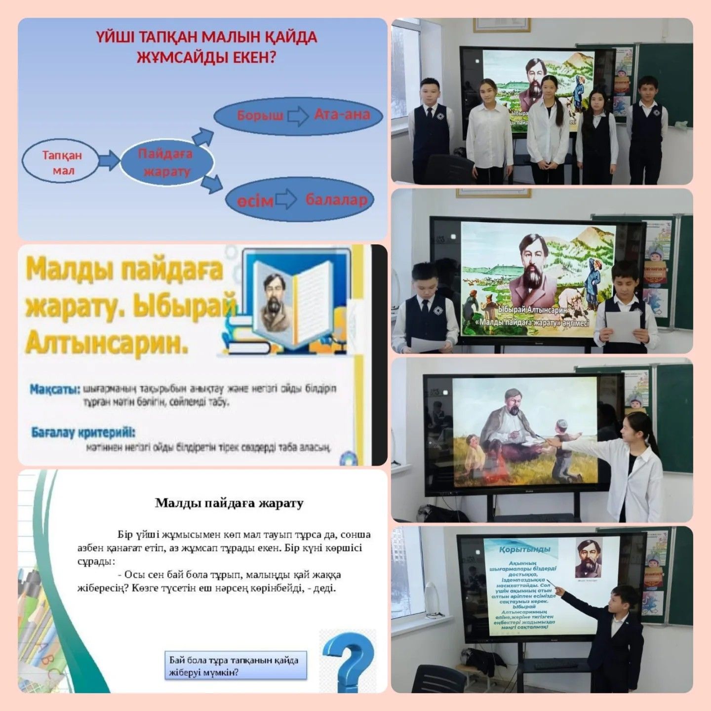 "Жас Ыбырай" үйірмесінің мүшелері Ы.Алтынсаринның "Малды пайдаға жарату" әңгімесін талдап, шығарманың құндылығы жайлы өз ойларын ортаға салды. Үйірме жетекшісі: Д. Д. Бұланбаев.…