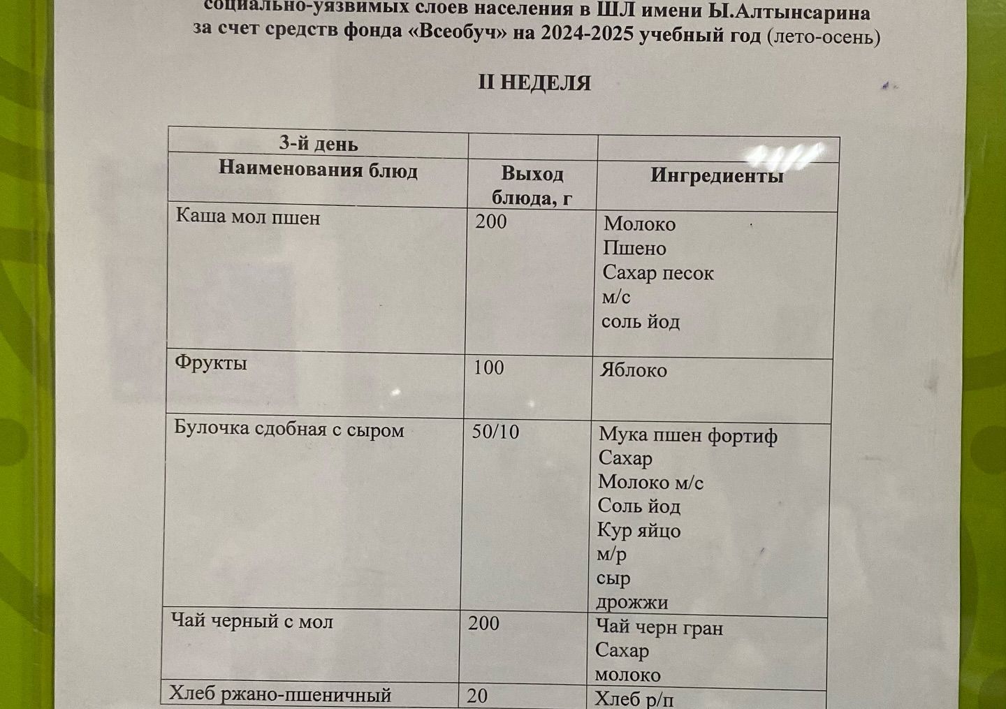 Одноразовое двухнедельное меню для 1-4 кл и для учащихся 5-11 кл из социально-уязвимых слоев населения в ШЛ им.Ы.Алтынсарина.