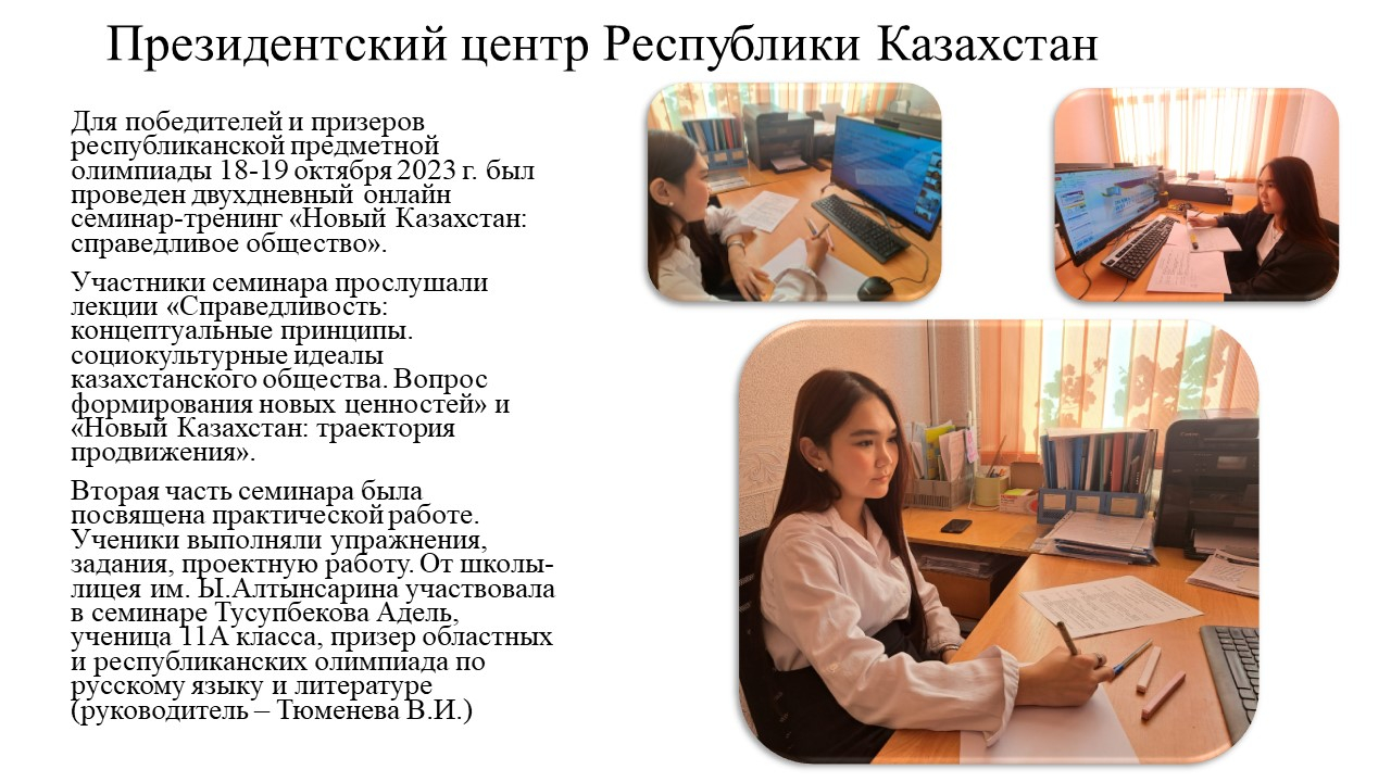 2023 жылғы 18-19 қазанда республикалық пәндік олимпиаданың жеңімпаздары мен жүлдегерлері үшін «Жаңа Қазақстан: әділ қоғам» атты екі күндік онлайн-тренинг өткізілді.