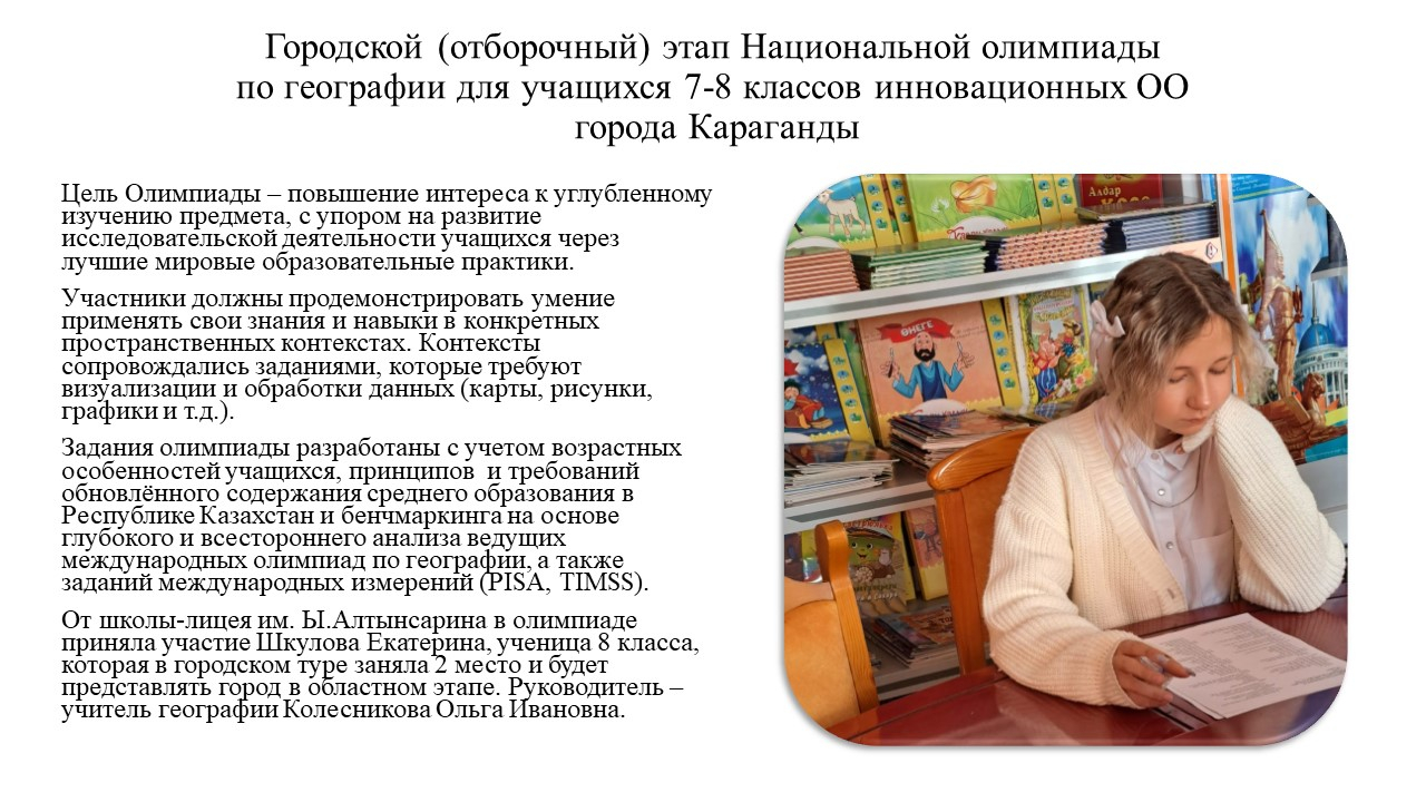 Қарағанды қаласының инновациялық ҚБ 7-8 сынып оқушылары үшін география бойынша ұлттық олимпиаданың қалалық (іріктеу) кезеңі