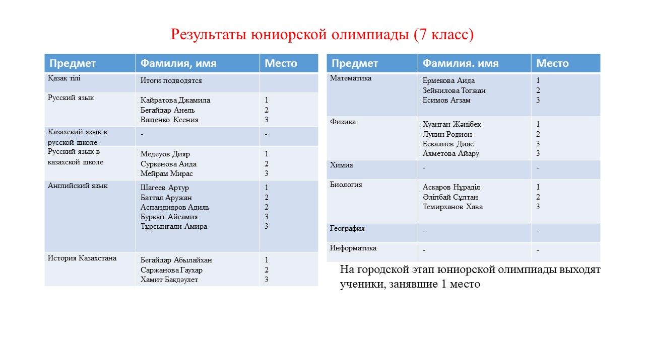 5-6, 7-8 және 9-11 сынып оқушыларына арналған пәндік олимпиадалардың бірінші кезеңі аяқталды.   Барлық жас санаттарында қалалық деңгейде өнер көрсететін жүлдегерлер мен жеңімпаздар анықталд…