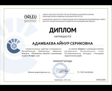 "Педагогикалық идеялар панорамасы"республикалық бейнесабақтар мен бейнедәрістердің байқауының өңірлік кезеңінің "Математика мұғалімі" аталымында жүлделі III орын үшін Адамбаева А…