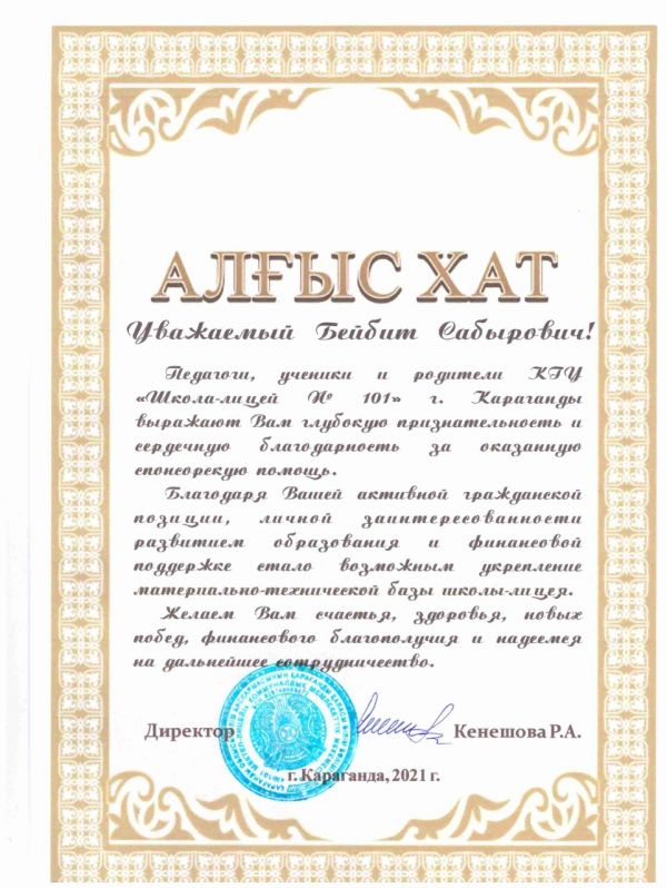 «Функционалдық сауаттылық: өзектілігі, мәселелері, шешу жолдары» тақырыбындағы XXIII аймақтық ғылыми - практикалық конференцияда озық іс-тәжірибесімен бөліскені үшін №101 мектеп-лицейіні…