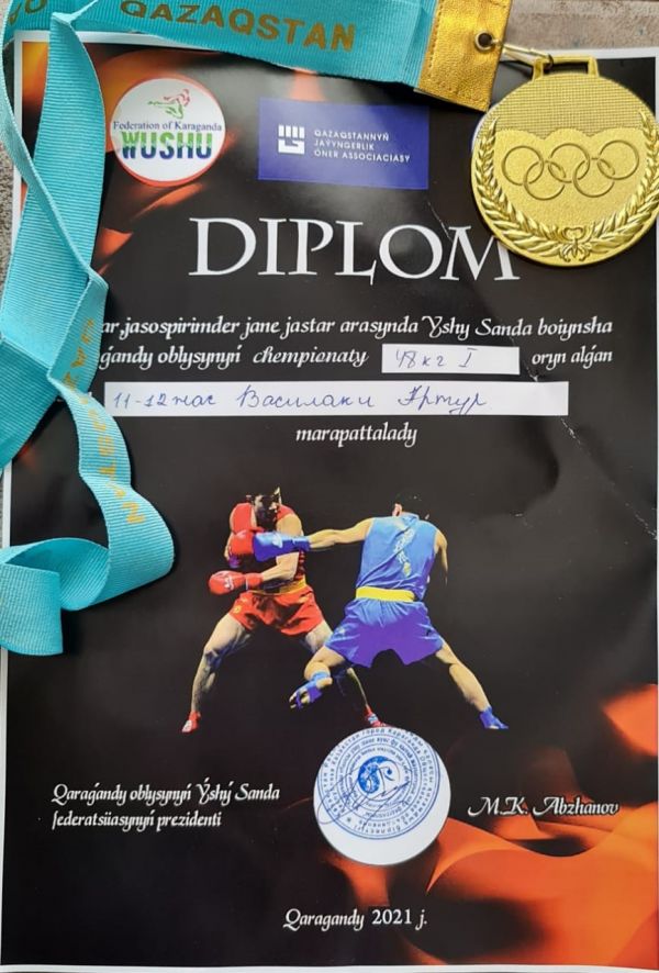 Артур Василаки, ученик 7 Г класса занял 1 место в чемпионате Карагандинской области по Ушу Санда.