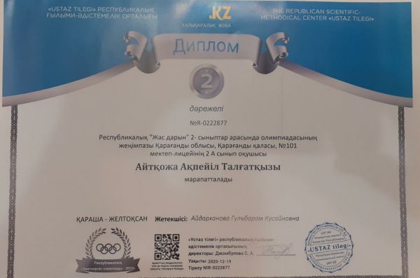 Республикалық  "Жас дарын" 2 сыныптар арасындағы олимпиадасының жеңімпазы  101 мектеп-лицейінің 2"А" сынып оқушысы Айтқожа Ақпейілді құттықтаймыз. Еңбегің жана берсін!…