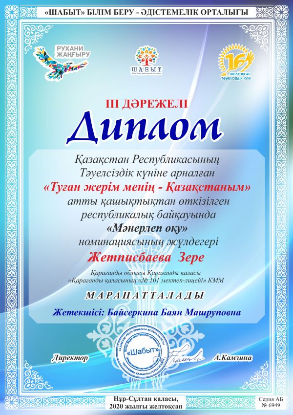 1А сынып оқушылары Жетписбаева Зере,Жанай Ақжол, Төкенов Шыңғыс, Қайрулла Аслан Қазақстан Республикасының Тәуелсіздік күніне арналған «Туған жерім менің - Қазақстаным» атты қашықтықтан өткізілген республикалық байқауына қатысып, «Мәнерлеп оқу» номинация