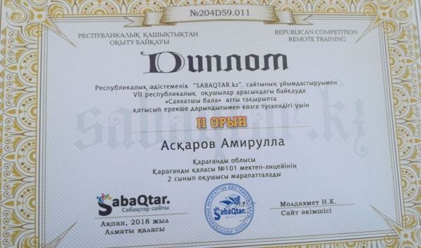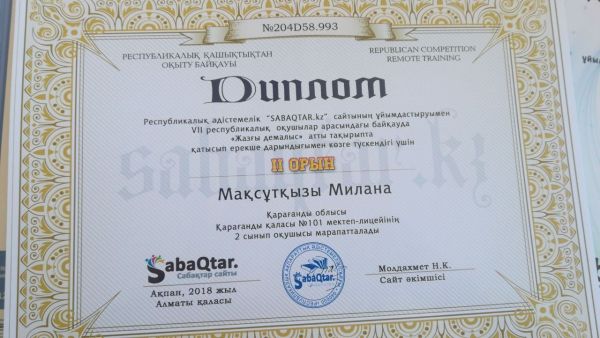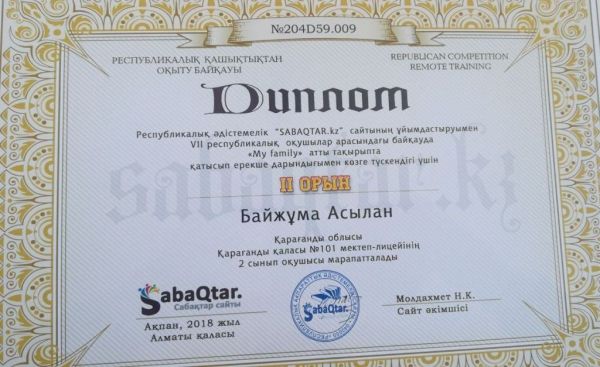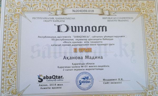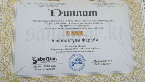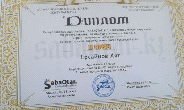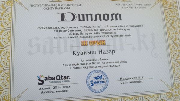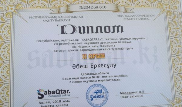 VII республикалық оқушылар арасындағы «Қашықтықтан оқыту» байқауларға қатысқан 2 Б сынып оқушылары І,ІІ, ІІІ орындарды иеленіп алғаны білімдерін жоғары көрсете алды.