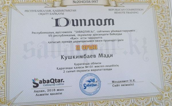 ОҚ ШҒА 48-ші ғылыми- практикалық конференциясы шеңберінде өткен 1- ші деңгейлі оқу зерттеу жұмыстары байқауына белсене қатысқаны үшін Тоқтаров Нұрислам Алғыс хатпен марапатталды.