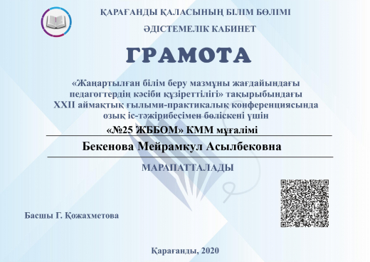 « №25 ЖББОМ»КММ қазақ тілі және әдебиет пәнінің мұғалімі Бекенова Мейрамгул Асылбековна марапатталады.