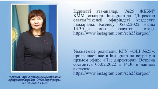 Уважаемые родители. КГУ «ОШ №25», приглашает вас в Instagram на встречу в прямом эфире «Час директора». Встреча состоится 05.02.2022 в 14.30 в данном аккаунте: https://www.instagram.com/sch25kargoo