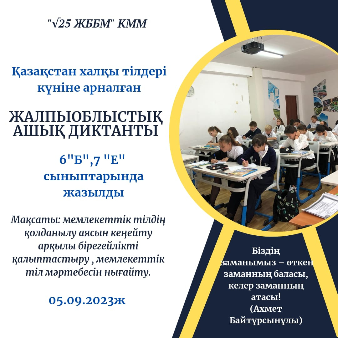 2023 жылдың қыркүйек айының 5 күні мектебімізде Қазақстан халқы тілдері күніне арналған ЖАЛПЫОБЛЫСТЫҚ АШЫҚ ДИКТАНТЫ 6 "Б", 7 "Е" сыныптарында алынды.