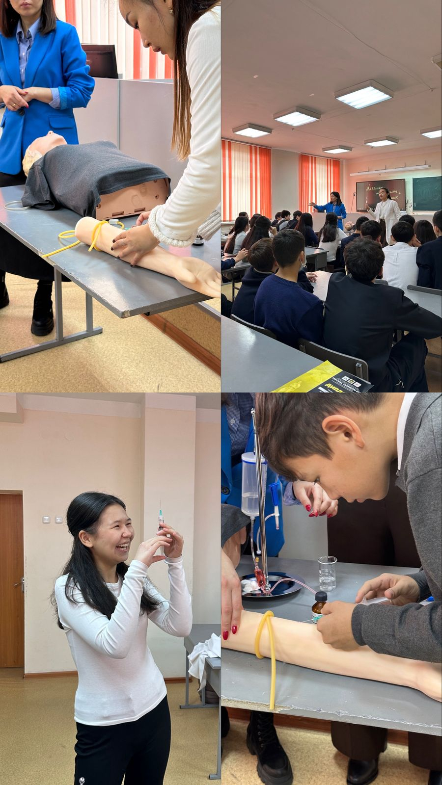 9 желтоқсан күні медициналық бағыттағы сыныптарға кіретін 9 "Б" және 8 "Ғ" сынып оқушыларына «Алғашқы көмек көрсету және медициналық ине салудағы алғы шарттар» тақырыбы аясында түсіндіру сабағы өткізілді. Сабақ барысында оқушылар теориялық мәліметтермен танысып, практикалық жұмыс жүргізді. Олар алғашқы көмектің негізгі шарттары мен адамға ине салу ережелерін тәжірибе жүзінде меңгерді. Пән мұғалімдері: Жалелова Д.Б., Рахимжанова А.Б.