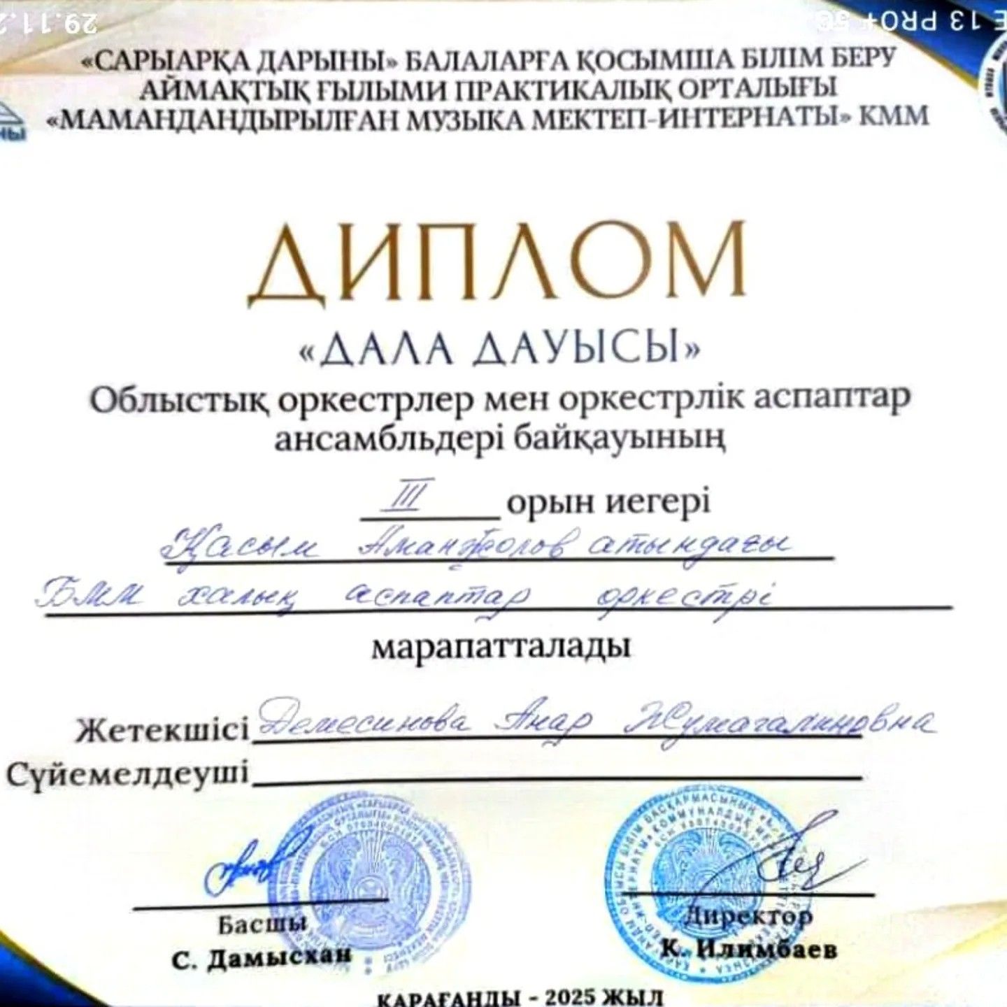 Байқауда "Шыңырау фольклорлық ансамблі 1 - орынға, жетекшісі Изтелеуов Салим Ауезханович және халық аспаптар оркестрі 3 - орынға, жетекшісі Демесинова Анар Жумагалиновна ие болды!!!