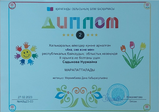 Халықаралық әйелдер күніне арналған «Ана, әже және мен» атты республикалық байқаудың облыстық кезеңінде біздің тәрбиеленушіміз Садықова Нұржайна 2-орын алды.