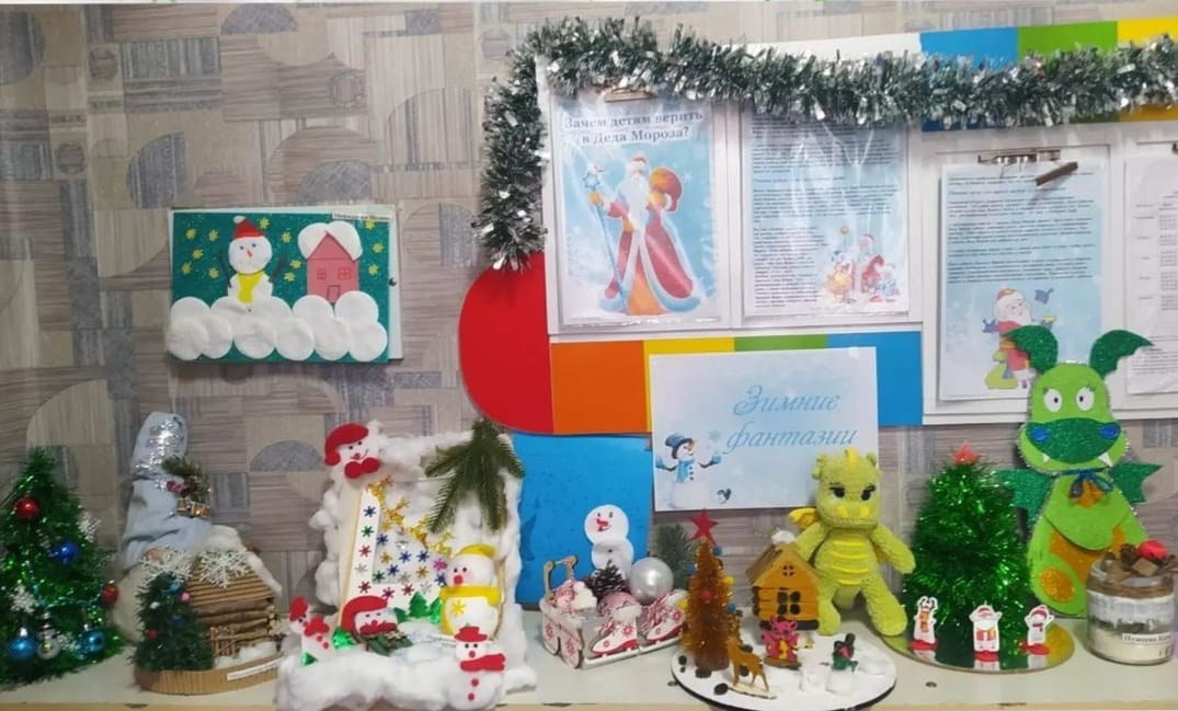 Доброй традицией в нашем детском саду стало проведение выставок совместного творчества детей и родителей. В декабре, перед праздником была проведена выставка поделок «Зимние фантазии». Для детей и родителей - любителей мастерить, фантазировать, творить – эта выставка была особенно интересна! Разнообразные поделки были сделаны руками детей и родителей из разнообразных материалов. Новогодние поделкисемейного творчества украсили наш детский сад и внесли неповторимый элемент в новогодний интерьер. Сколько у детей было радости в глазах и гордости за поделку, выполненную своими руками вместе с родителями.