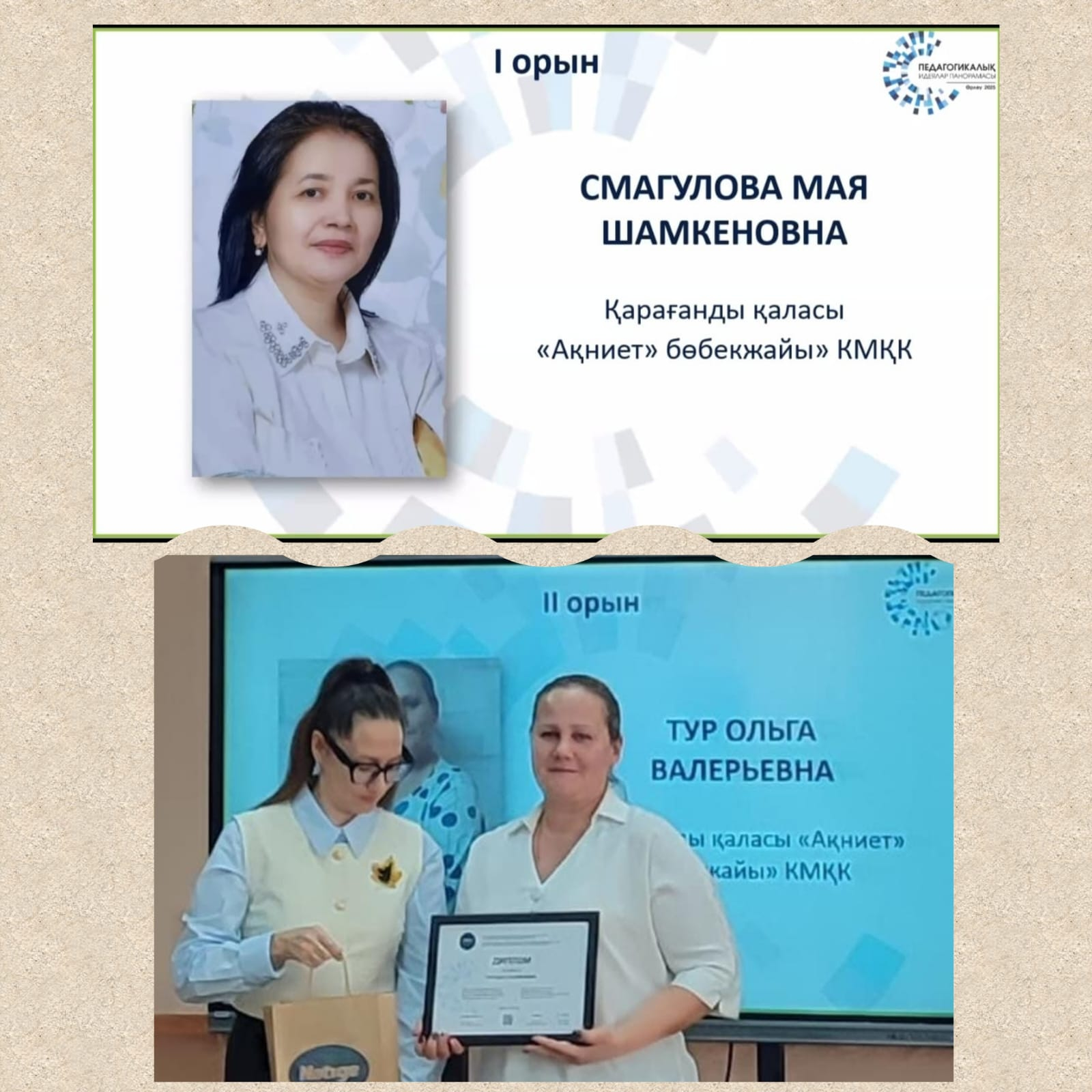 2025 жылдың 7 қазанында «Өрлеу» біліктілікті арттыру ұлттық орталығы» АҚ Қарағанды облысы бойынша филиалында «Педагогикалық идеялар панорамасы – 2025» атты республикалық байқауының өңірлік кезеңі өткізілді. Осы байқаудың қортындысы бойыныша біздің педагогтар Смагулова Мая Шамкеновна 1 орын, Тур Ольга Валерьевна 2 орын жүлдері орын алды. Жеңістерімен құттықтаймыз!
