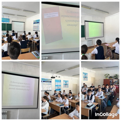 Құқықтық сауаттылық апталығына орай 5”Д” сыныбында “ Мен және менің құқықтарым” атты сынып сағаты өтті. Мақсаты: оқушылардың өз Отанын сүюге, өз құқықтарын білуге, біреудің құқығын таптамауға тәрбиелеу.