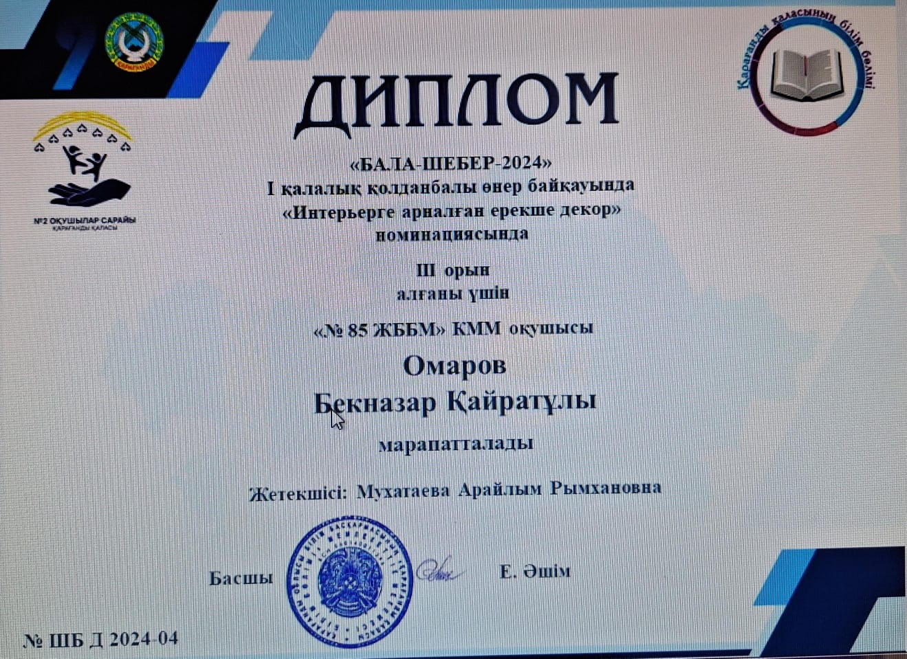 "Бала-Шебер-2024" I қалалық қолданбалы өнер байқауында жүлделі орын иеленген 4 "Ә" сынып оқушысы Омаров Бекназарды құттықтаймыз!