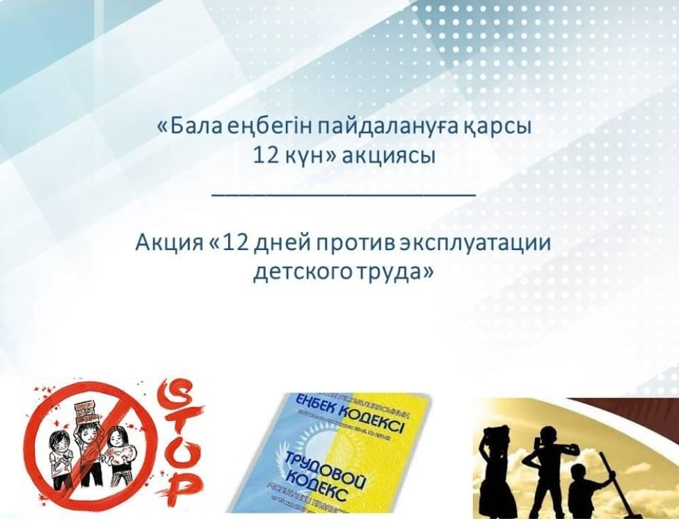 С 1 по 12 июня Национальной информационной кампанией проводится акция «12 дней против эксплуатации детского труда», целью которой является привлечение внимания общественности, в том числе взрослых, детей и их родителей к вопросам профилактики применения наихудших форм детского труда, а также правовое информирование в данной сфере.