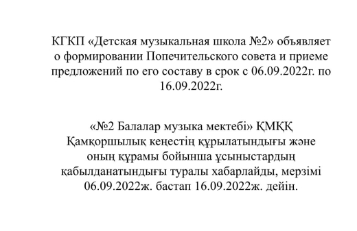КГКП «Детская музыкальная школа №2» объявляет о формировании Попечительского совета и приеме предложений по его составу в срок с 06.09.2022г. по 16.09.2022г.