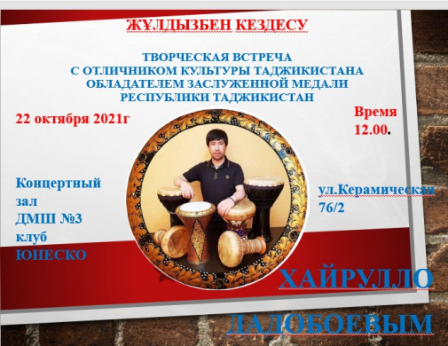 "Жұлдызбен кездесу"проектіінің шеңберінде Тәжікістан Республикасының мәдениет үздігі ХАЙРУЛЛО Дадобоевпен шығармашылық кездесу өткізіледі.