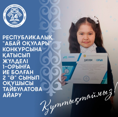 "Ақберен" республикалық танымдық шығармашылық журналы ұйымдастырған Республикалық "Абай оқулары" конкурсына қатысып, жүлделі 1 орынға ие болғаны үшін 2"Ә" сынып оқушысы Тайбулатова Айару марапатталды.