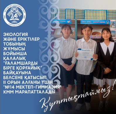 Экология және еріктілер тобының жұмысы бойынша қалалық "Ғаламшарды бірге қорғайық" байқауына белсене қатысып ll орын алғаны үшін "№14 мектеп-гимназия" КММ марапатталады Жобаға қатысқан оқушылар: Скандарова Адема 9"А" Төлеу Арыстан 9"А" Молданазарова Айдан