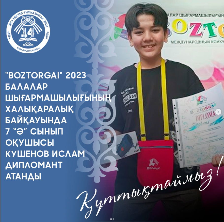 7 "ә" сынып оқушысы Кушенов Ислам "BOZTORGAI" 2023 @boztorgai_konkurs балалар шығармашылығының халықаралық байқауына қатысып дипломант атанды